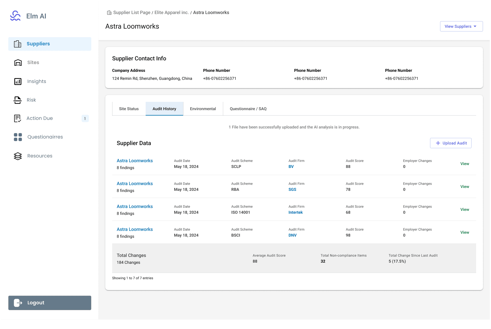 This page gives users a high-level view of supplier performance over time, making it easy to spot recurring critical compliance issues across multiple reports.