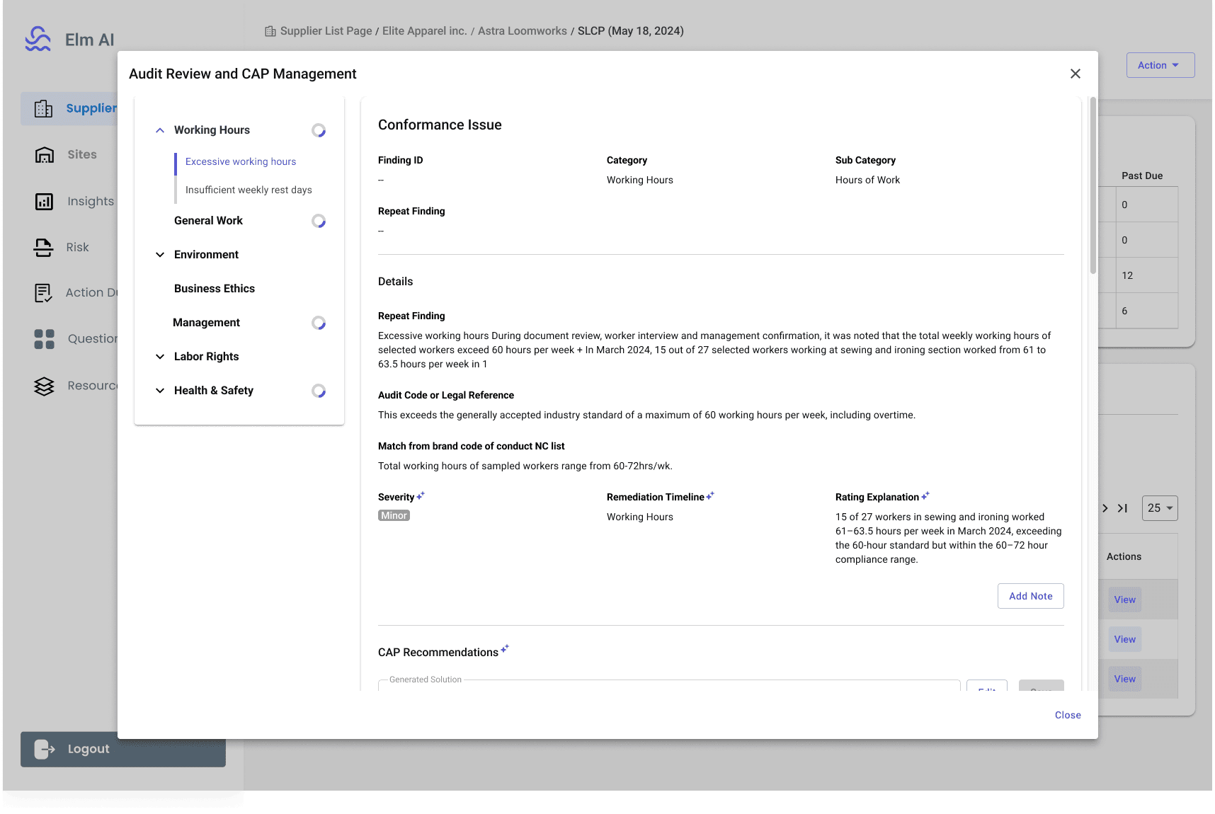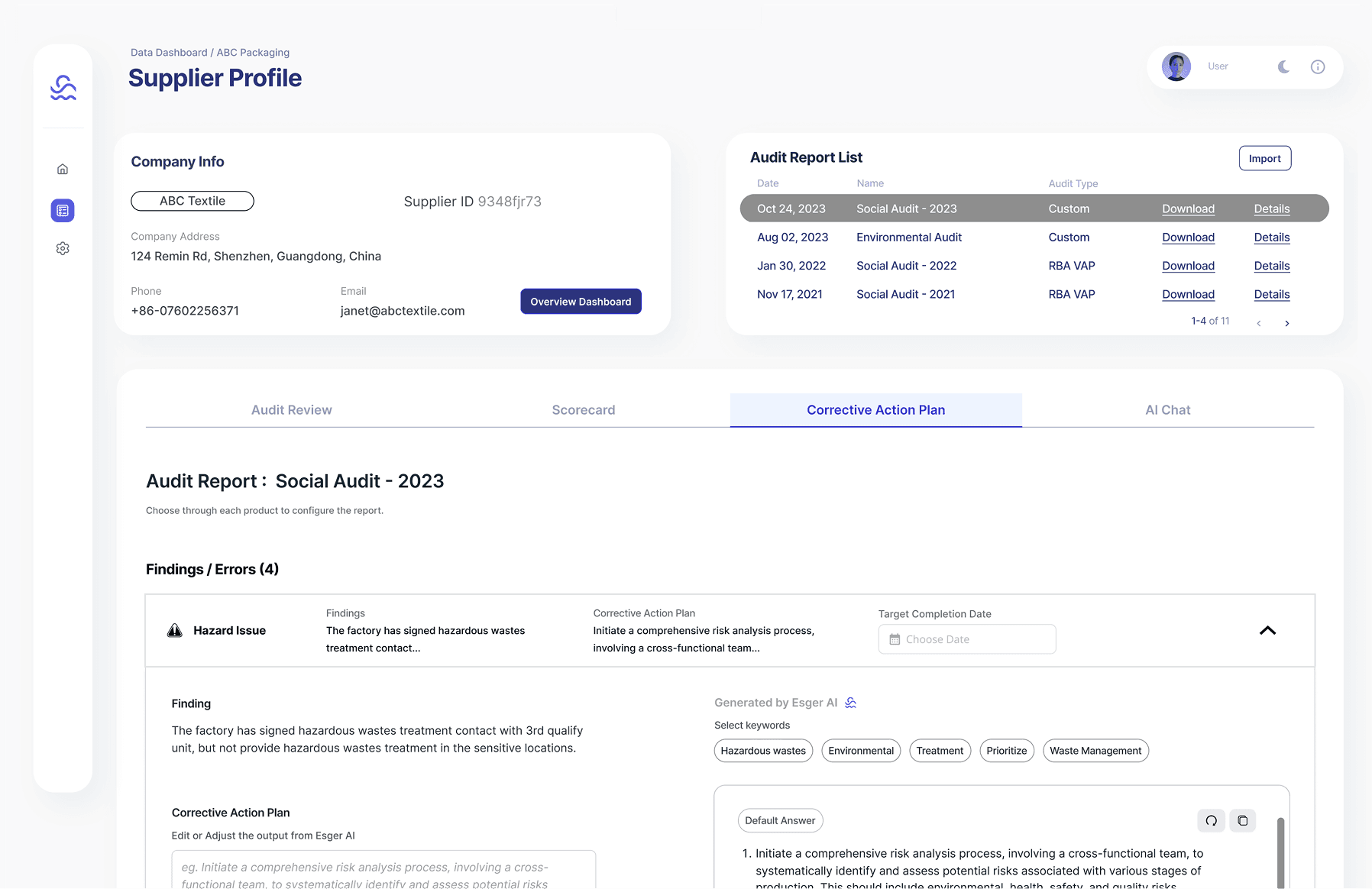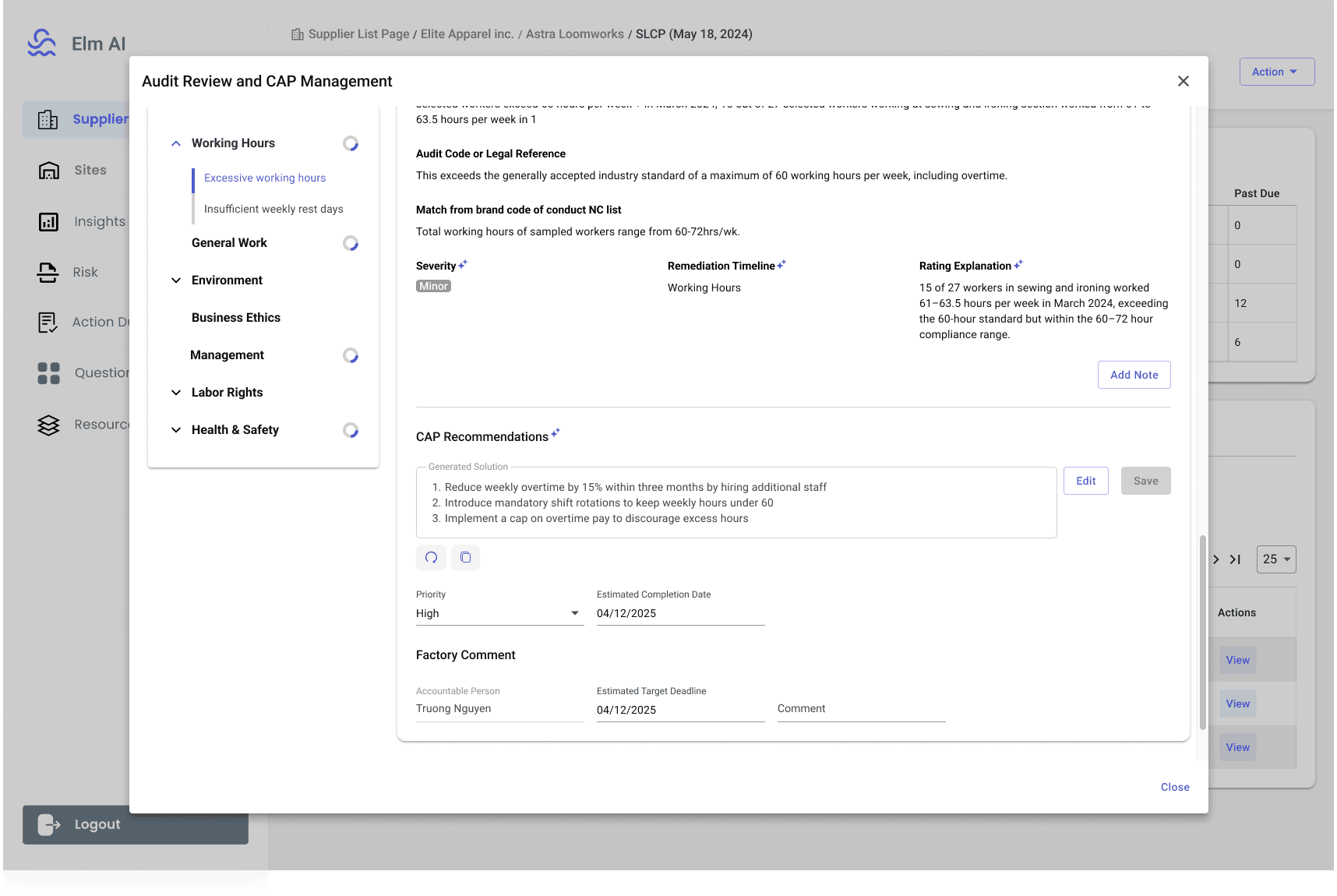 Explore opportunities to expand the Corrective Action Plan (CAP) feature by leveraging AI to deliver more tailored and strategic recommendations. This includes auto-prioritizing critical non-compliances, generating more robust action plans for recurring issues, and compiling comprehensive, supplier-facing plans that encourage long-term remediation and accountability.