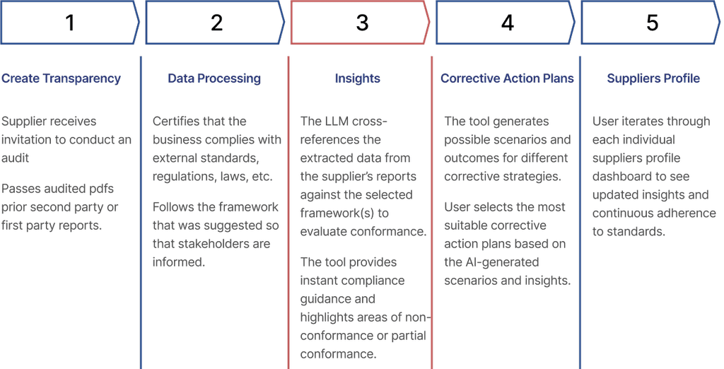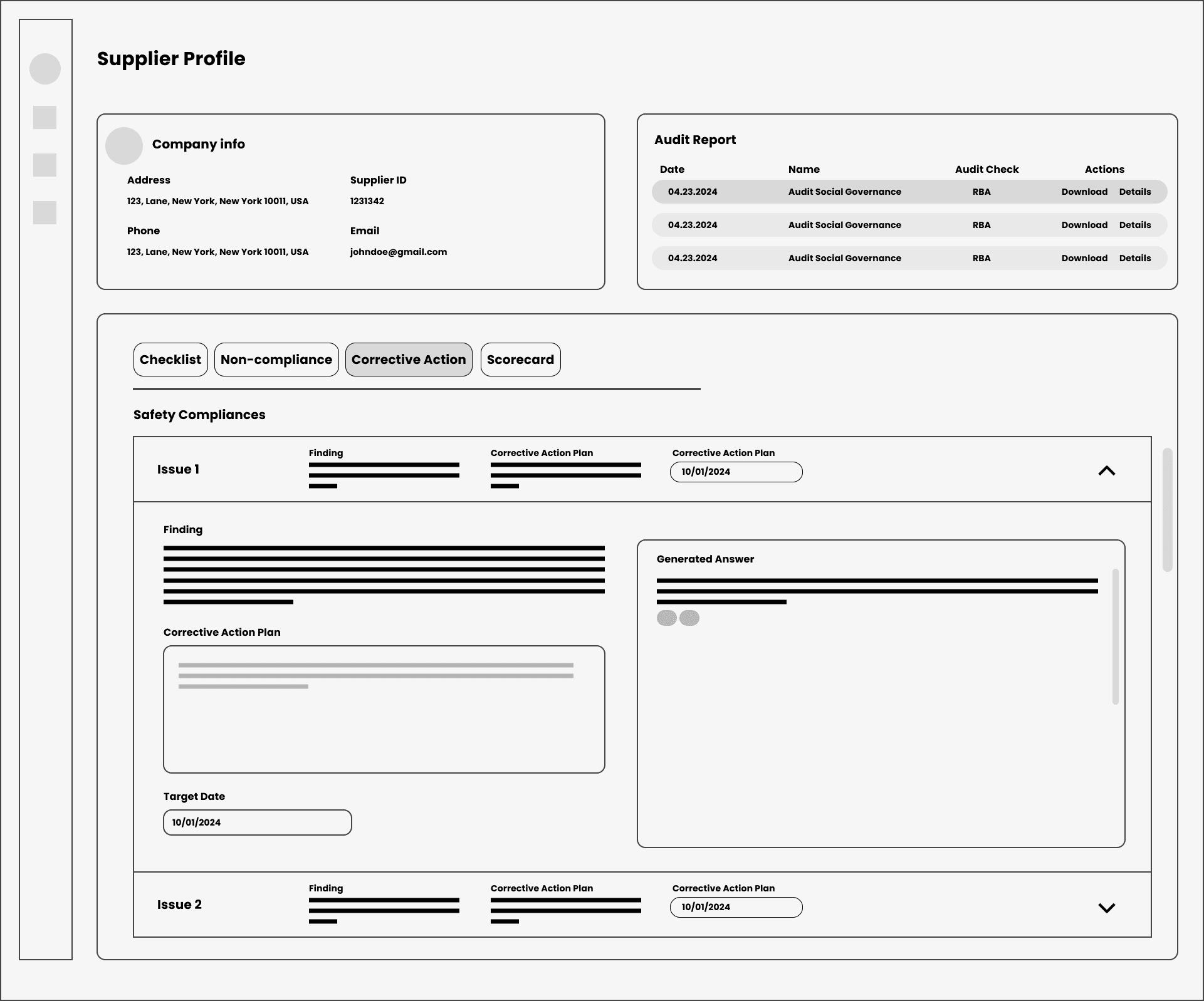 While engineers were developing LLM models around ESG standards and regulations, our focus was to create a user flow that aligns with existing capabilities and address the core pain points uncovered in research — fragmented non‑compliance data, unclear supplier risk context, and manual corrective actions.