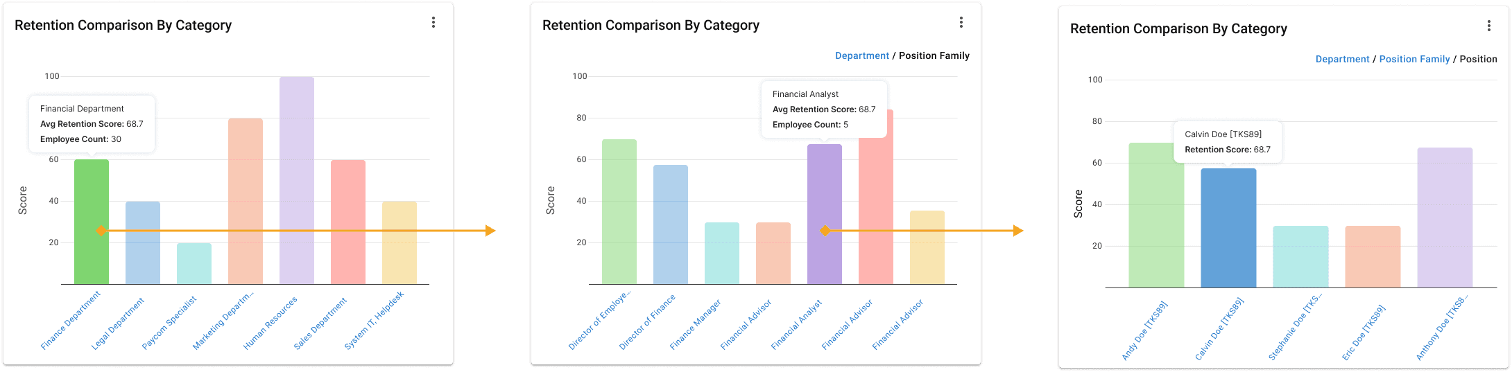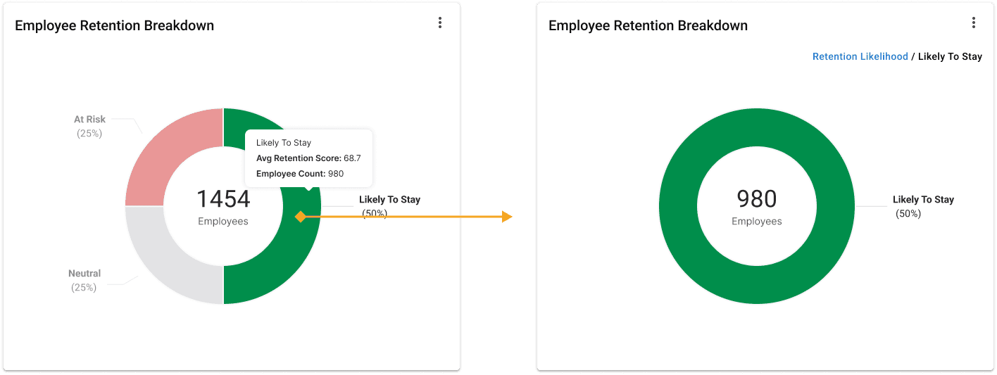 I designed a retention score visualization that allows managers to benchmark employees against peers, teams, or departments over time. This comparative approach surfaces both individual risks and organizational trends, enabling managers to take proactive measures to improve retention. By providing a clear, scalable view of performance patterns, the visualization helps ensure data-driven decisions around employee engagement and organizational strategy.