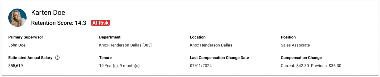 The employee details page serves as a way for managers to roll up more granular retention data for individual employees.
