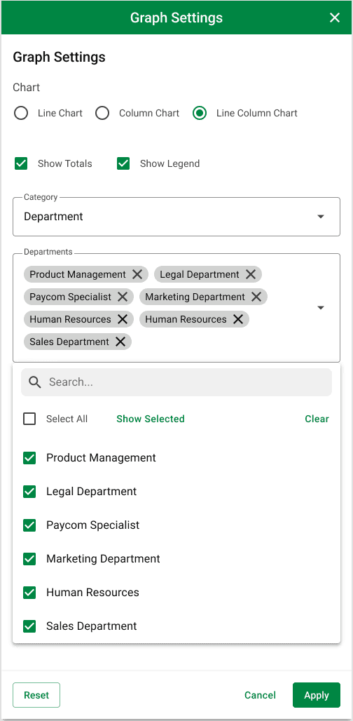 User research revealed that while managers valued additional visuals, they wanted greater control over how the information was displayed. To address this, I designed three levels of customization—chart type, category/sub-category, and date range—allowing managers to tailor retention insights to their specific needs.
