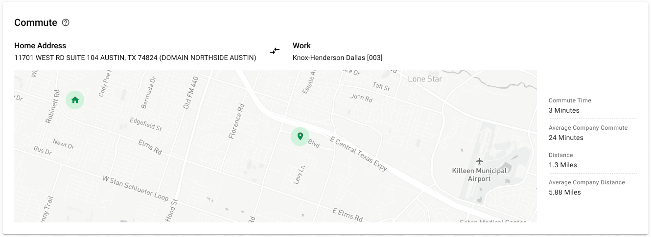 Because commute time significantly influenced retention scores, I designed a zoomable map to show commute distances in context—making it easy to compare an employee’s commute against company averages and identify potential risk factors.